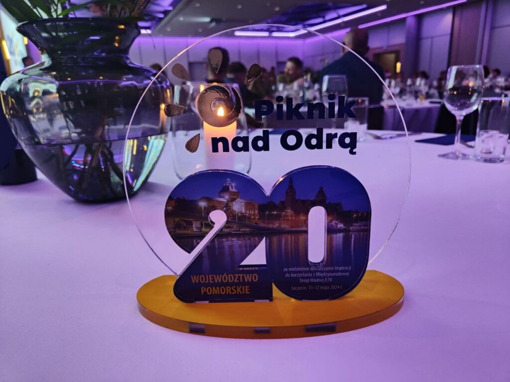 At the gala evening for exhibitors held at the Hotel “Courtyard by Marriott Szczecin City” in Szczecin, the organisers honoured, among others, the exhibitors taking part in the annual Picnic on the Oder. The Pomorskie Voivodeship was also among those honoured for many years of providing inspiration for the use of the International Waterway E70. Of the five voivodeships: Pomorskie, Warmińsko-Mazurskie, Kujawsko-Pomorskie, Wielkopolskie and Lubuskie, it is Pomorskie that is the coordinator of the IWW E70 agreement. This award was earned by the entire IWW E70 team. A commemorative statuette was received by employees of the Marshal’s Office of the Lubuskie Voivodeship who manned the IWW E70 stand: Małgorzata Rudnicka and Konrad Grzegrzółka.